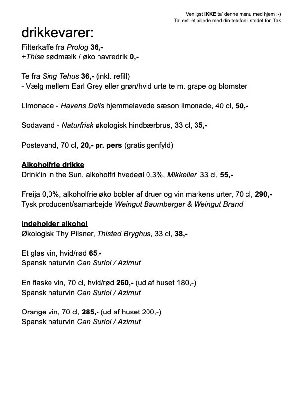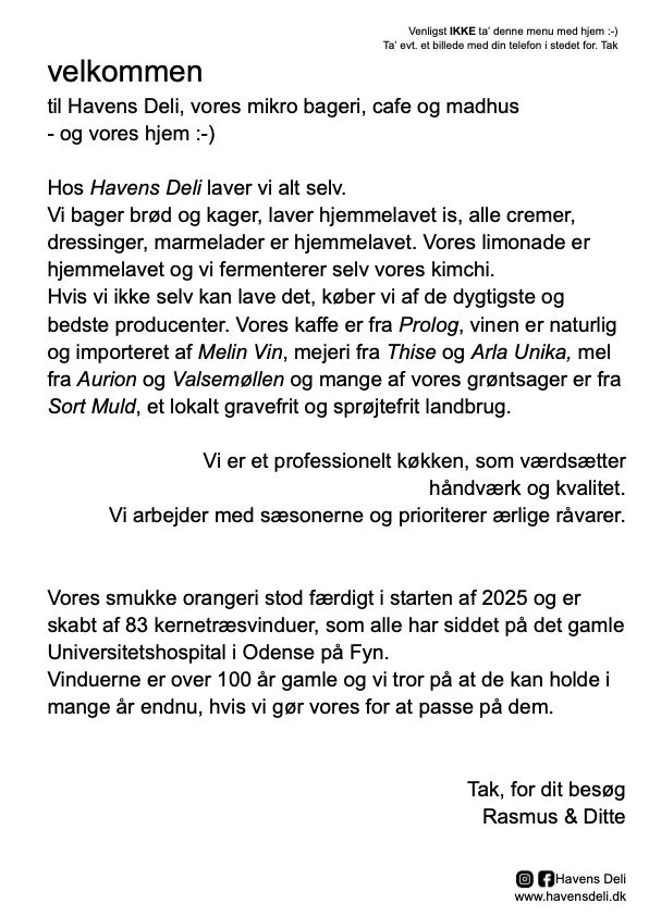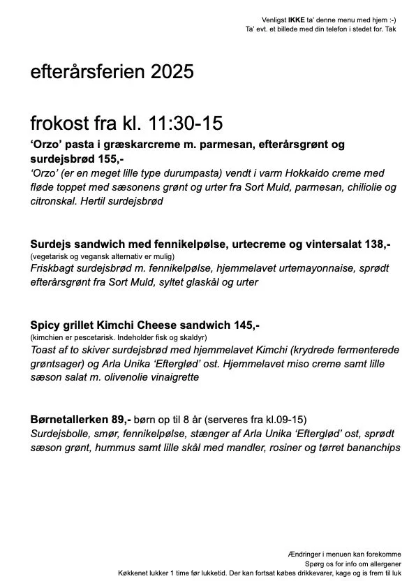 Se venligst vores aktuelle menu for daglig bageri og cafe nedenforVores menu skifter ofte i takt med sæsonerne og der kan løbende forekomme mindre ændringer.